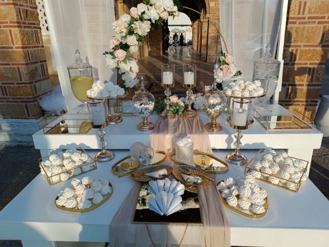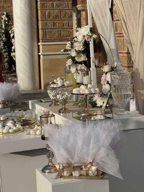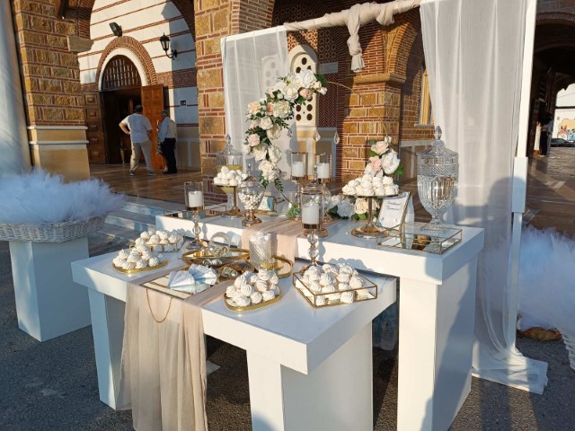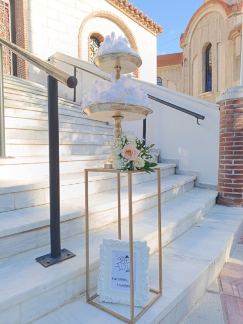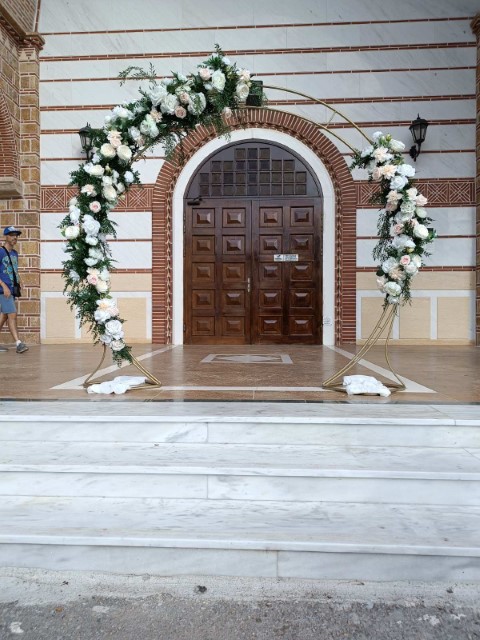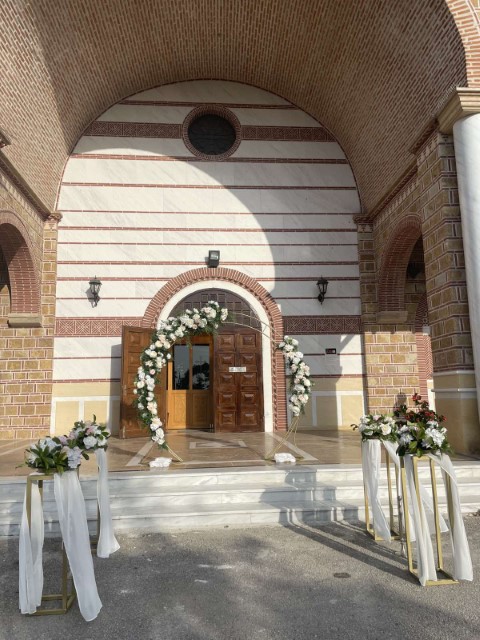Ρομαντικός γάμος στο Πανόραμα Θεσσαλονίκης. Εντυπωσιακή  αψίδα και μεταλλικά σταντ με συνθέσεις λουλουδιών στην είσοδο της εκκλησίας, τραπέζι υποδοχής που φιλοξένησε τα γλυκά και τις μπομπονιέρες με κεντρικό στοιχείο κυκλική αψίδα , διακοσμημένο με κρυστάλλινα κηροπήγια και πιατέλες και μοναδικές πινελιές που απογείωσαν το σκηνικό.