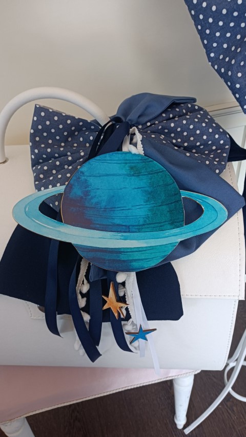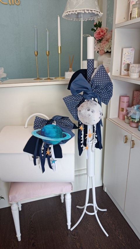Χειροποίητη λαμπάδα βάπτισης για αγόρι, διακοσμημένη με φιγούρες από πλανήτες. Συνδυάζεται με την αντίστοιχη τσάντα, λαδόπανο και μπομπονιέρα. Μπορούν να γίνουν αλλαγές στα χρώματα, στα υφάσματα και στο θέμα της πινακίδας, κατόπιν συνεννοήσεως με το κατάστημά μας.