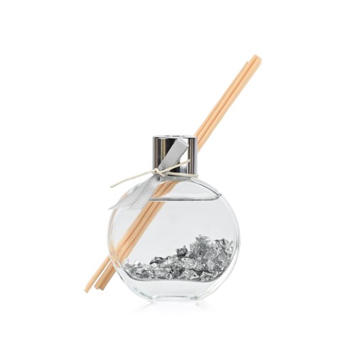 Μπομπονιέρα αρωματικό χώρου με ασημένια φύλλα και άρωμα Lily and Lotus 60ml. Δεμένη με πέντε κουφέτα Χατζηγιαννάκη.