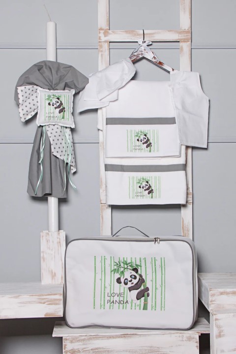 Σετ βάπτισης για αγόρι με θέμα panda, που αποτελείται από τσάντα, λαμπάδα, λαδόπανα και λαδοσέτ, όλα συνδυασμένα αρμονικά μεταξύ τους και κατασκευασμένα με εξαιρετικής ποιότητας υλικά. Υπάρχει η δυνατότητα επιλογής μεμονωμένων κομματιών.