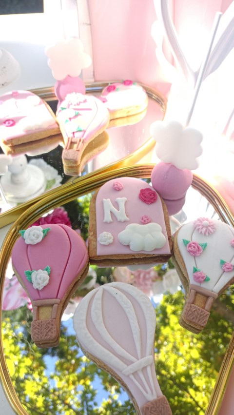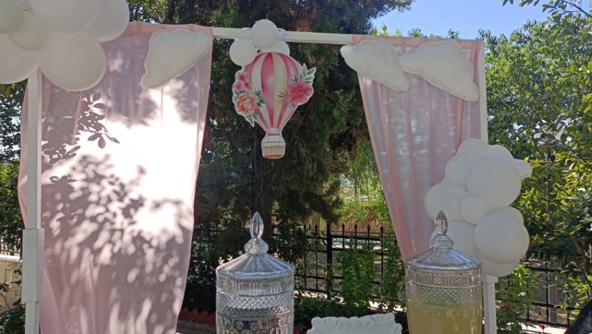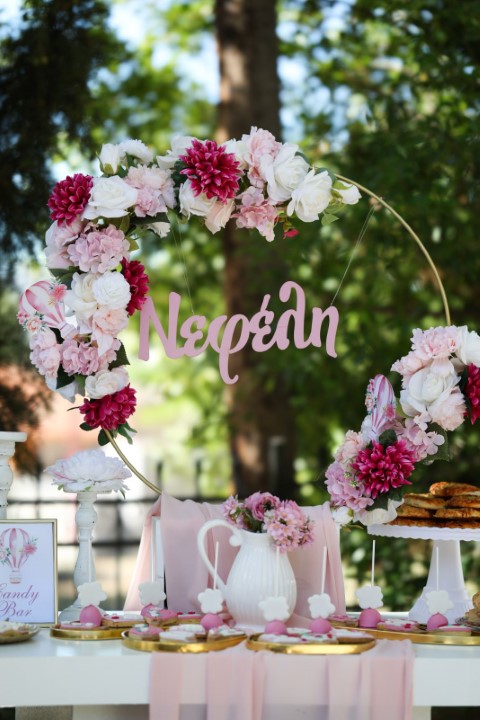 Όμορφη βάπτιση με θέμα το αερόστατο σε λευκές και ροζ αποχρώσεις. Candy bar με λαχταριστά γλυκά, κεντρικό στοιχείο στο dessert table η στρόγγυλη μεταλλική βάση διακοσμημένη με λουλούδια και το όνομα της νεοφώτιστης, μπαλόνια, φιγούρες από αερόστατα και δωράκια για τους καλεσμένους, όλα βασισμένα και συνδυασμένα με το concept. Εντυπωσιακή η διακόσμηση της αψίδας, όπου φωτογραφήθηκαν όλοι οι καλεσμένοι με την μικρή Νεφέλη.