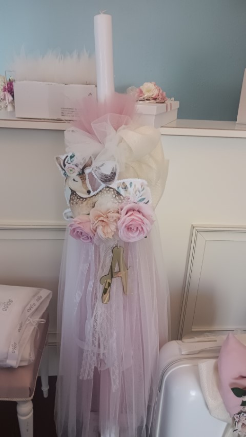 Χειροποίητη λαμπάδα βάπτισης για κορίτσι, διακοσμημένη με ξύλινη φιγούρα ελαφάκι. Συνδυάζεται με την αντίστοιχη βαλίτσα, λαδόπανο και λαδοσέτ. Μπορούν να γίνουν αλλαγές στα χρώματα, στα υφάσματα και στο θέμα της φιγούρας, κατόπιν συνεννοήσεως με το κατάστημά μας.