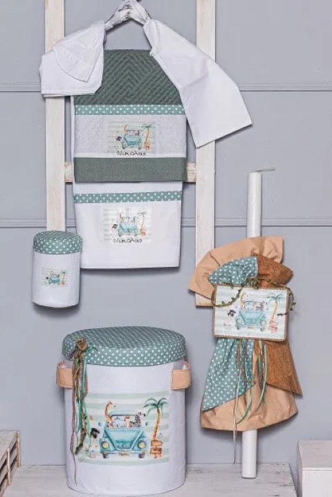 Σετ βάπτισης για αγόρι με θέμα ζωάκια του δάσους, που αποτελείται από λαμπάδα, κουτί κατασκευασμένο από τσόχα, λαδόπανα και λαδοσέτ, όλα συνδυασμένα αρμονικά μεταξύ τους και κατασκευασμένα με εξαιρετικής ποιότητας υλικά. Υπάρχει η δυνατότητα επιλογής μεμονωμένων κομματιών.