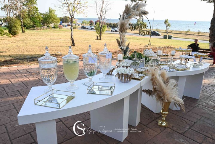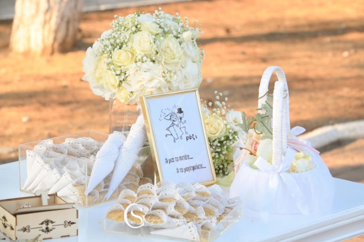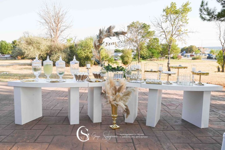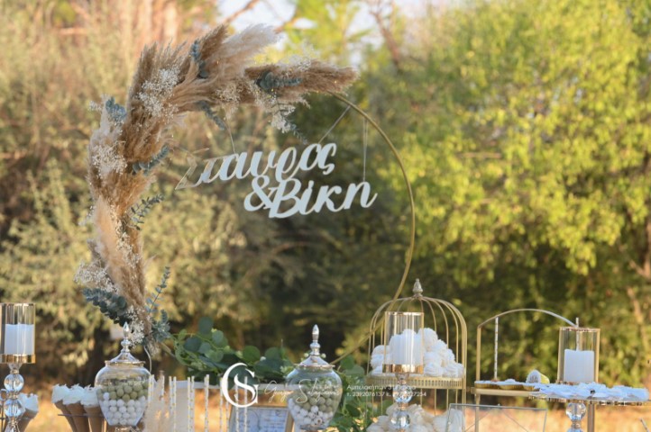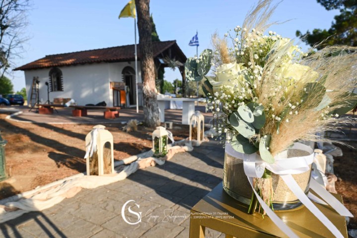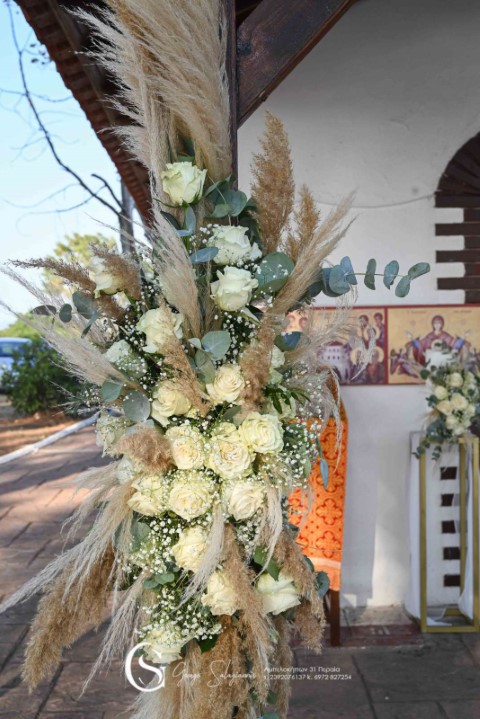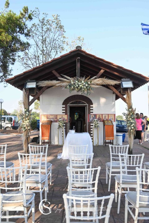 Όμορφος γάμος σε παραμυθένιο ξωκλήσι στο Αγγελοχώρι. Εντυπωσιακές συνθέσεις με λευκά τριαντάφυλλα, ευκάλυπτο και pampas grass. Αέρινα υφάσματα, γυάλινα βάζα σε μεταλλικά σταντ, λαχταριστά γλυκά εδέσματα και δροσερά ποτά, δημιούργησαν έναν υπέροχο συνδυασμό απλότητας και κομψότητας!