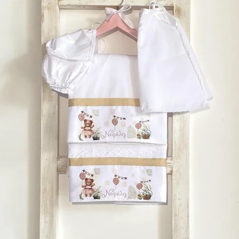 Σετ λαδόπανα βάπτισης για κορίτσι με θέμα αρκουδάκι. Το σετ περιλαμβάνει πετσέτα, σεντόνι, εσώρουχα και καπελάκι. Δυνατότητα εκτύπωσης του δικού σας θέματος.
