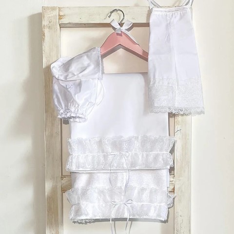 Σετ λαδόπανα βάπτισης για κορίτσι με δαντέλα και βολάν. Το σετ περιλαμβάνει πετσέτα, σεντόνι, εσώρουχα και καπελάκι.