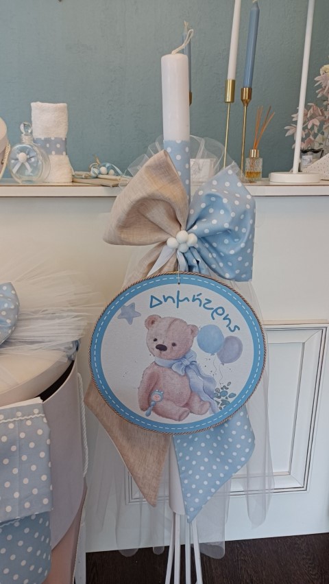 Χειροποίητη λαμπάδα βάπτισης για αγόρι, από υφάσματα εξαιρετικής ποιότητας σε γαλάζιες, λευκές και μπεζ αποχρώσεις. Διακοσμημένη με ξύλινη θεματική πινακίδα. Συνδυάζεται με την αντίστοιχη τσάντα, λαδόπανο και μπομπονιέρα. Μπορούν να γίνουν αλλαγές στα χρώματα, στα υφάσματα και στο θέμα της πινακίδας, κατόπιν συνεννοήσεως με το κατάστημά μας.
