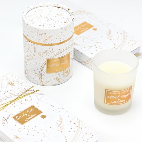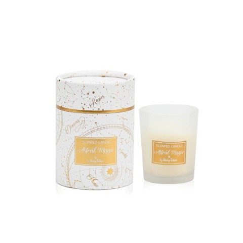 Μπομπονιέρα κερί astral magic, σε όμορφη συσκευασία στα χρώματα του λευκού και του χρυσού. Η μπομπονιέρα είναι δεμένη με πέντε κουφέτα Χατζηγιαννάκη. Διαστάσεις: ύψος 9 x 6,5 διάμετρο.