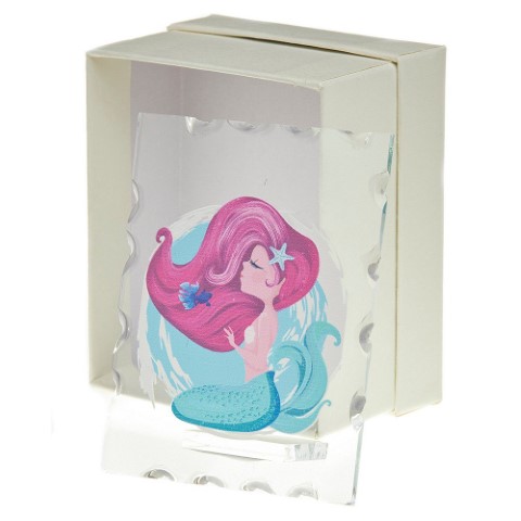 Μπομπονιέρα βάπτισης γυάλινη κορνίζα με γοργόνα. Στην τιμή περιλαμβάνονται το κουτί και πέντε κουφέτα Χατζηγιαννάκη. Διαστάσεις κορνίζας: 8x6εκ.