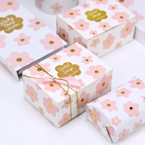Μπομπονιέρα βάπτισης για κορίτσι σαπουνάκι 100γρ. σε πολυτελή συσκευασία με χρυσές λεπτομέρειες και άρωμα white jasmine. Δεμένη με πέντε κουφέτα Χατζηγιαννάκη. Ελάχιστη ποσότητα παραγγελίας 40τμχ.