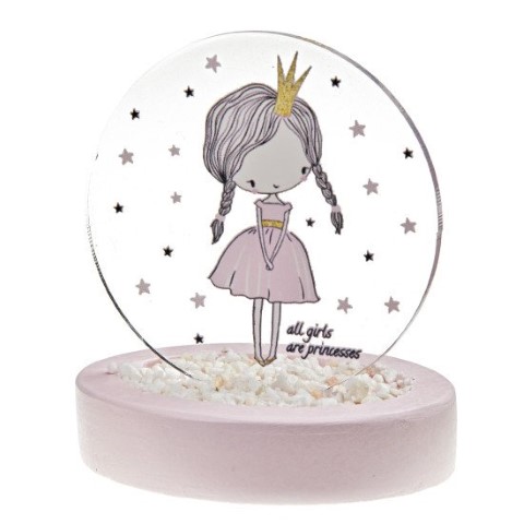 Μπομπονιέρα plexiglass σε κεραμική βάση με θέμα πριγκίπισσα. Η μπομπονιέρα περιλαμβάνει πέντε κουφέτα Χατζηγιαννάκη. Διαστάσεις: ύψος 7εκ.