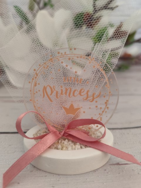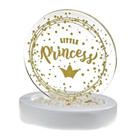 Μπομπονιέρα plexiglass σε κεραμική βάση με θέμα little princess. Η μπομπονιέρα περιλαμβάνει πέντε κουφέτα Χατζηγιαννάκη. Διαστάσεις: ύψος 7εκ.