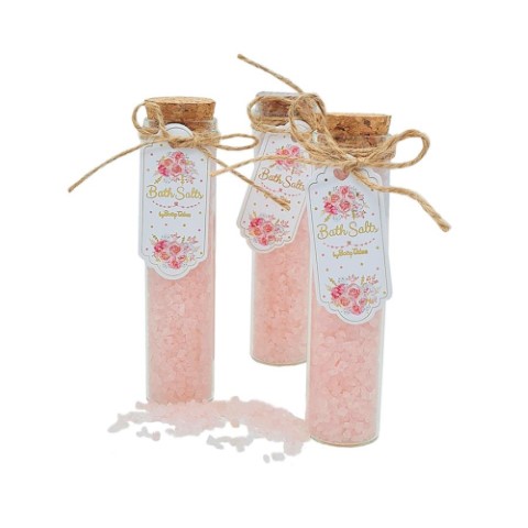 Μπομπονιέρα βάπτισης για κορίτσι άλατα μπάνιου σε ροζ χρώμα 80γρ. μέσα σε γυάλινο δοχείο 2,5x12,5εκ. σε άρωμα white musk & jasmine. Η μπομπονιέρα περιλαμβάνει πέντε κουφέτα Χατζηγιαννάκη.