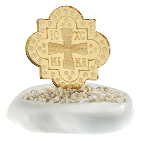 Μπομπονιέρα βάπτισης plexiglass σταυρός σε βραχάκι, δεμένη με πέντε κουφέτα. Διαστάσεις: ύψος 8 εκ.
