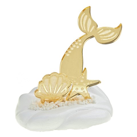 Μπομπονιέρα βάπτισης plexiglass γοργόνα σε βραχάκι, δεμένη με πέντε κουφέτα. Διαστάσεις: ύψος 8 εκ.