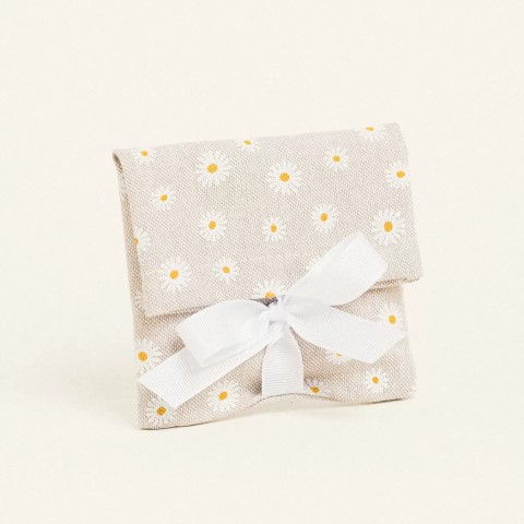 Μπομπονιέρα βάπτισης για κορίτσι πουγκί με μαργαρίτες που διπλώνει και κλείνει με κορδέλα. Περιέχει πέντε κουφέτα Χατζηγιαννάκη. Διαστάσεις: 12x17εκ.