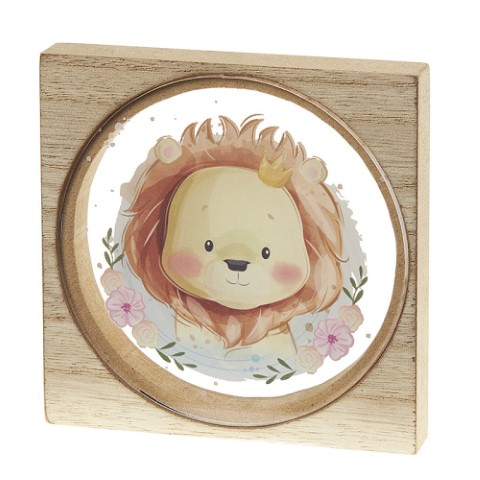 Μπομπονιέρα ξύλινη κορνίζα με plexiglass λιονταράκι και πέντε κουφέτα Χατζηγιαννάκη. Διαστάσεις: 10x10x2εκ.