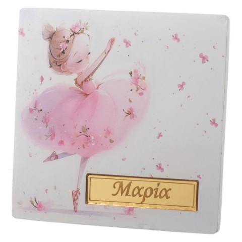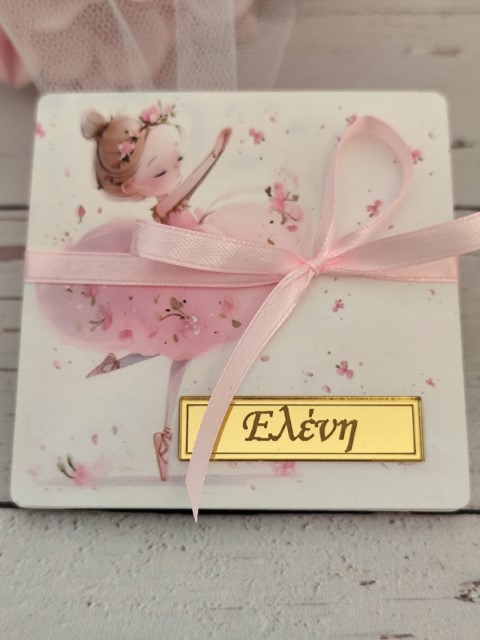 Μπομπονιέρα βάπτισης τετράγωνο σουβέρ με επιλογή ονόματος σε plexiglass, θέμα μπαλαρίνα και δεμένη με πέντε κουφέτα. Διάστασεις: 10x10 εκ.