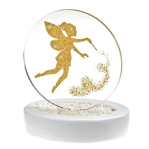 Μπομπονιέρα plexiglass σε κεραμική βάση με θέμα Tinker Bell. Η μπομπονιέρα περιλαμβάνει πέντε κουφέτα Χατζηγιαννάκη. Διαστάσεις: ύψος 7εκ.
