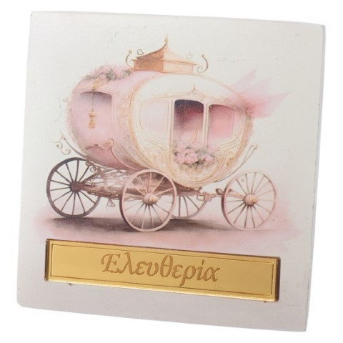 Μπομπονιέρα βάπτισης τετράγωνο σουβέρ με επιλογή ονόματος σε plexiglass, θέμα άμαξα και δεμένη με πέντε κουφέτα. Διάστασεις: 10x10 εκ.