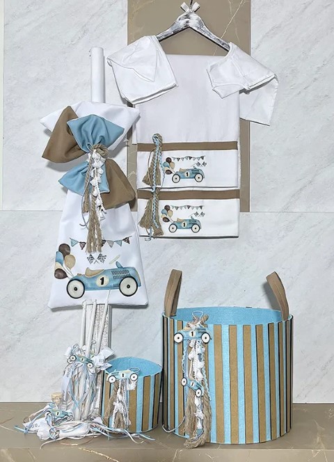Σετ βάπτισης για αγόρι με θέμα vintage αυτοκινητάκι που αποτελείται από καλάθι, λαμπάδα, λαδόπανα και λαδοσέτ, όλα συνδυασμένα αρμονικά μεταξύ τους και κατασκευασμένα από εξαιρετικής ποιότητας υλικά. Υπάρχει η δυνατότητα επιλογής μεμονωμένων κομματιών.
