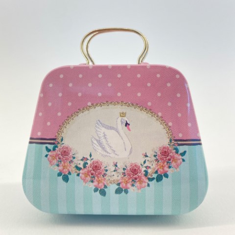Μπομπονιέρα βάπτισης για κορίτσι ροζ μεταλλικό βαλιτσάκι με κύκνο. Διαστάσεις: Ύψος 5,5εκ. x Μήκος 7εκ. x Πλάτος 3εκ.). Περιέχει πέντε κουφέτα Χατζηγιαννάκη.