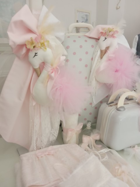 Λαμπάδα βάπτισης για κορίτσι, διακοσμημένη με χειροποίητο μαξιλαράκι κύκνο. Συνδυάζεται με την αντίστοιχη βαλίτσα, λαδόπανο και λαδοσέτ. Μπορούν να γίνουν αλλαγές στα χρώματα, στα υφάσματα και στο θέμα της λαμπάδας, κατόπιν συνεννοήσεως με το κατάστημά μας.
