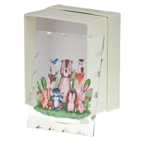 Μπομπονιέρα βάπτισης γυάλινη κορνίζα με τα ζωάκια του δάσους. Στην τιμή περιλαμβάνονται το κουτί και πέντε κουφέτα Χατζηγιαννάκη. Διαστάσεις κορνίζας: 8x6εκ.