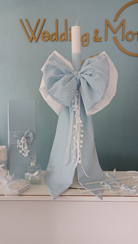 Χειροποίητη λαμπάδα βάπτισης για αγόρι, κατασκευασμένη από υφάσματα εξαιρετικής ποιότητας σε γαλάζιες και λευκές αποχρώσεις, και διακοσμημένη με διπλό εντυπωσιακό φιόγκο. Συνδυάζεται με την αντίστοιχη βαλίτσα ή τσάντα, λαδόπανο και λαδοσέτ. Μπορούν να γίνουν αλλαγές στα χρώματα, στα υφάσματα και στο θέμα της πινακίδας, κατόπιν συνεννοήσεως με το κατάστημά μας.