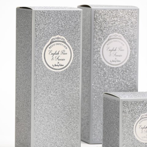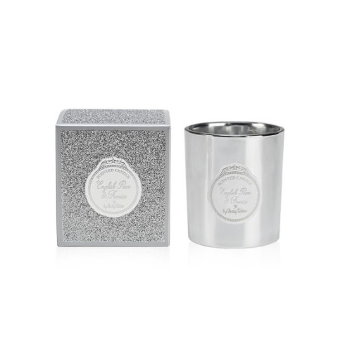 Αρωματικό σετ σε πολυτελή συσκευασία με ασημί glitter και άρωμα English pear, που περιλαμβάνει αρωματικό χώρου, κεράκι και πέντε κουφέτα Χατζηγιαννάκη. Αρωματικό χώρου διαστάσεις κουτιού: 21x7,5εκ. μπουκαλάκι διάμετρος 7x8εκ. Κερί 120γρ.