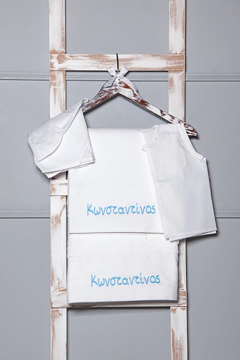 Σετ λαδόπανα βάπτισης για αγόρι βαμβακερά, με τυπωμένο όνομα σε φάσα. Το σετ περιλαμβάνει πετσέτα, σεντόνι, εσώρουχα και καπελάκι. Συνδυάζεται με την αντίστοιχη τσάντα, λαμπάδα και μπομπονιέρα. Για αλλαγές στα χρώματα ή στο τύπωμα, επικοινωνήστε με το κατάστημά μας.
