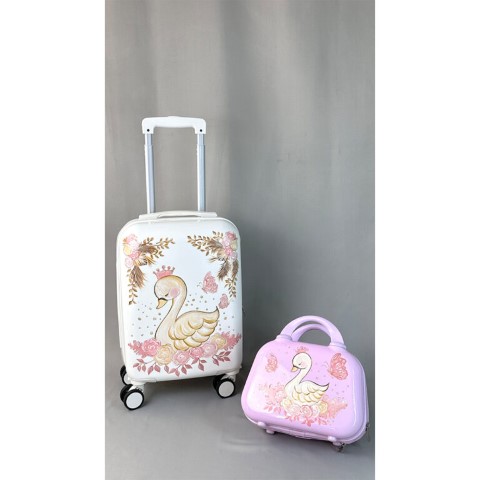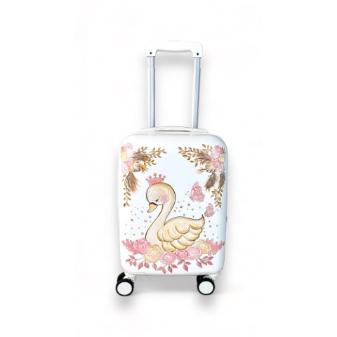 Ζωγραφιστή βαλίτσα trolley βάπτισης για κορίτσι με θέμα κύκνος. Συνδυάζεται με την αντίστοιχη λαμπάδα, λαδόπανο και λαδοσέτ. Διαστάσεις: 52x32x20εκ.