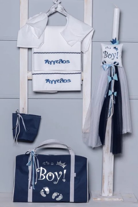 Σετ βάπτισης για αγόρι με θέμα baby boy, που αποτελείται από αδιάβροχο σάκο, λαμπάδα, λαδόπανα και λαδοσέτ, όλα συνδυασμένα αρμονικά μεταξύ τους και κατασκευασμένα με εξαιρετικής ποιότητας υλικά. Υπάρχει η δυνατότητα επιλογής μεμονωμένων κομματιών.