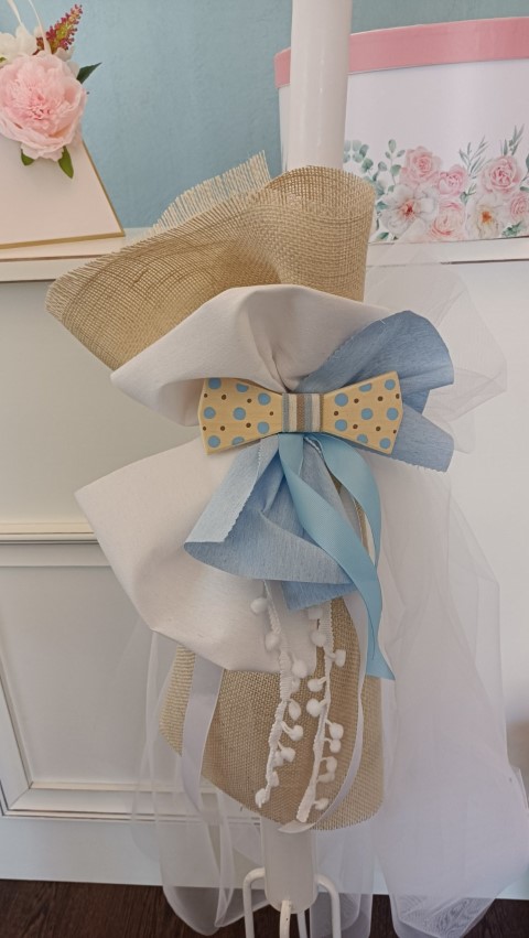 Λαμπάδα βάπτισης με ξύλινο παπιγιόν, διακοσμημέμη με υφάσματα σε μπεζ, λευκές και γαλάζιες αποχρώσεις.