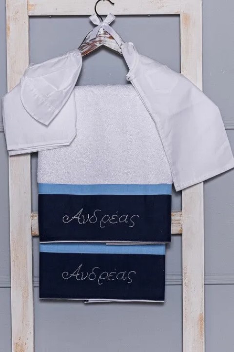 Σετ λαδόπανα βάπτισης για αγόρι βαμβακερά, με κεντημένο το όνομα του παιδιού στην φάσα. Το σετ περιλαμβάνει πετσέτα, σεντόνι, εσώρουχα και καπελάκι. Συνδυάζεται με την αντίστοιχη τσάντα, λαμπάδα και μπομπονιέρα. Για αλλαγές στα χρώματα επικοινωνήστε με το κατάστημά μας.