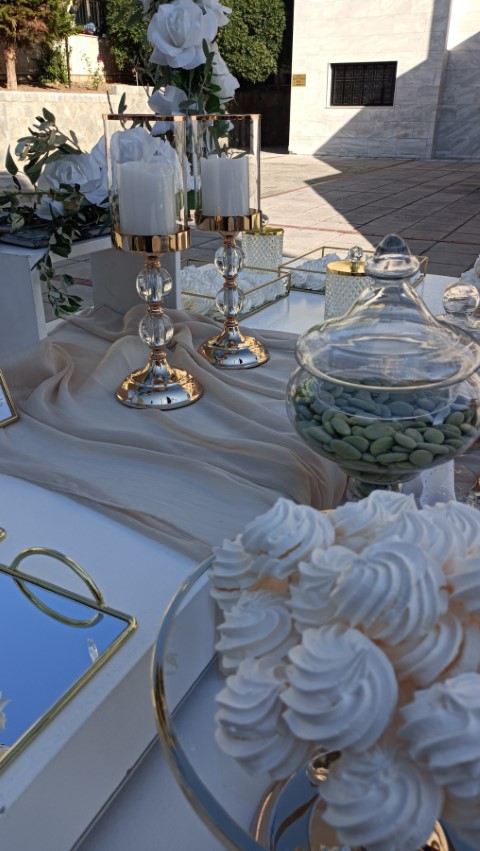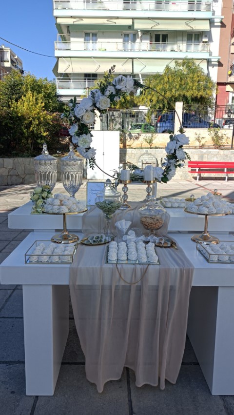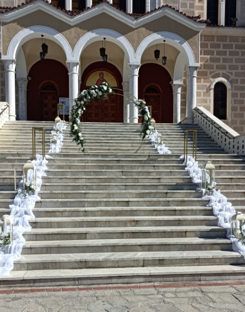 Υπέροχος καλοκαιρινός γάμος σε αποχρώσεις του λευκού με χρυσές λεπτομέρειες. Εντυπωσιακός ο στολισμός της σκάλας, με κεντρικό στοιχείο, την στρόγγυλη μεταλλική αψίδα διακοσμημένη με λευκά τριαντάφυλλα. Ένας γάμος γεμάτος όμορφες λεπτομέρειες και παραμυθένια λάμψη.