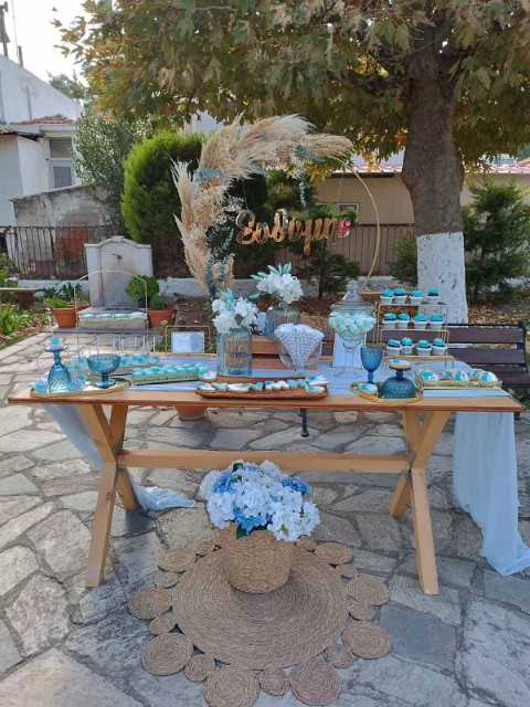 Elegant bohemian στολισμό για την βάπτιση του Ευθύμη. Κυρίαρχο χρώμα το γαλάζιο με χρυσές λεπτομέρειες στα διακοσμητικά και υπέροχα βάζα με pampas και ορτανσίες. Εντυπωσιακό dessert table με κεντρικό στοιχείο μεταλλικό κύκλο και στο κέντρο το όνομα του μωρού. Ποικιλία γλυκών με εντυπωσιακό συνδυασμό γεύσεων και χρωμάτων. Απολαύστε το φωτογραφικό υλικό και ελάτε να δημιουργήσουμε έναν μοναδικό στολισμό για την βάπτιση του παιδιού σας!