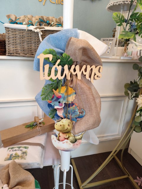 Χειροποίητη λαμπάδα βάπτισης για αγόρι, διακοσμημένη με ξύλινες φιγούρες δεινοσαυράκια και το όνομα του παιδιού. Συνδυάζεται με την αντίστοιχη βαλίτσα ή τσάντα, λαδόπανο και λαδοσέτ. Μπορούν να γίνουν αλλαγές στα χρώματα, στα υφάσματα και στο θέμα της πινακίδας, κατόπιν συνεννοήσεως με το κατάστημά μας.
