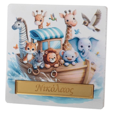 Μπομπονιέρα βάπτισης τετράγωνο σουβέρ με επιλογή ονόματος σε plexiglass, θέμα ζωάκια του δάσους και δεμένη με πέντε κουφέτα. Διάστασεις: 10x10 εκ.