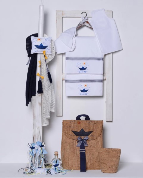 Σετ βάπτισης για αγόρι με θέμα καραβάκι, που αποτελείται από λαμπάδα, σακίδιο κατασκευασμένο από φελλό, (φυσικό οικολογικό υλικό) λαδόπανο και λαδοσέτ, όλα συνδυασμένα αρμονικά μεταξύ τους και κατασκευασμένα με εξαιρετικής ποιότητας υλικά. Υπάρχει η δυνατότητα επιλογής μεμονωμένων κομματιών.