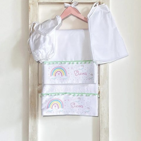 Σετ λαδόπανα βάπτισης για κορίτσι με θέμα ουράνιο τόξο. Το σετ περιλαμβάνει πετσέτα, σεντόνι, εσώρουχα και καπελάκι. Δυνατότητα εκτύπωσης του δικού σας θέματος.