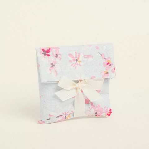 Μπομπονιέρα βάπτισης για κορίτσι floral πουγκί που διπλώνει και κλείνει με κορδέλα. Περιέχει πέντε κουφέτα Χατζηγιαννάκη. Διαστάσεις: 12x17εκ.