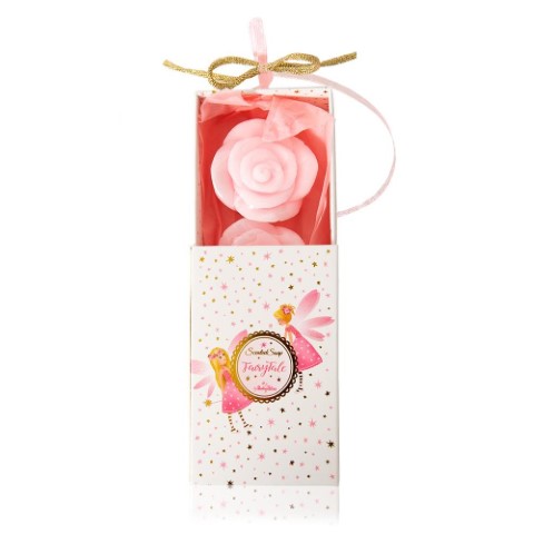 Μπομπονιέρα βάπτισης σαπουνάκια λουλουδάκια μέσα σε κουτάκι με νεράιδες. Περιλαμβάνει πέντε κουφέτα Χατζηγιαννάκη. Διαστάσεις: 9x5,5x3 εκ.