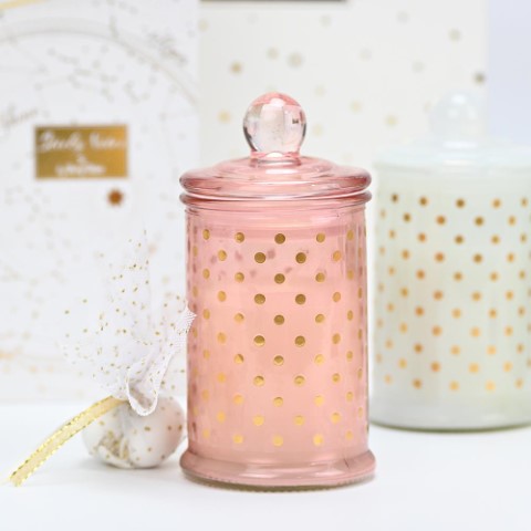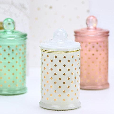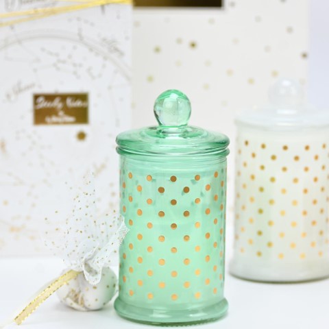 Μπομπονιέρα κερί σε γυάλινο πουά ψηλό βάζο και άρωμα fresh floral, σε τρία διαφορετικά χρώματα βεραμάν, ροζ και λευκό. Περιλαμβάνει πέντε κουφέτα Χατζηγιαννάκη. Διαστάσεις: 6x11 εκ.