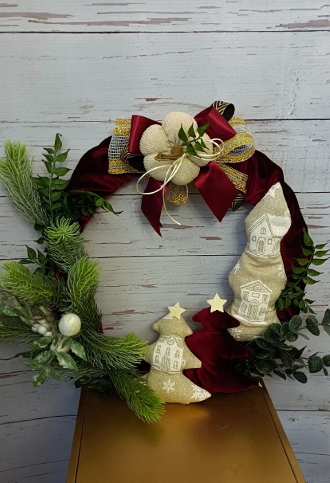 Πρωτότυπο χειροποίητο στεφάνι μπορντό βελούδο με δεντράκια κατασκευασμένα από ύφασμα. Διάμετρος 40εκ.