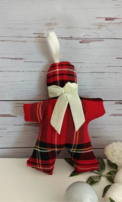 Χριστουγεννιάτικο στολίδι ανθρωπάκι κατασκευασμένο από καρό ύφασμα. Διαστάσεις: 18x13εκ.