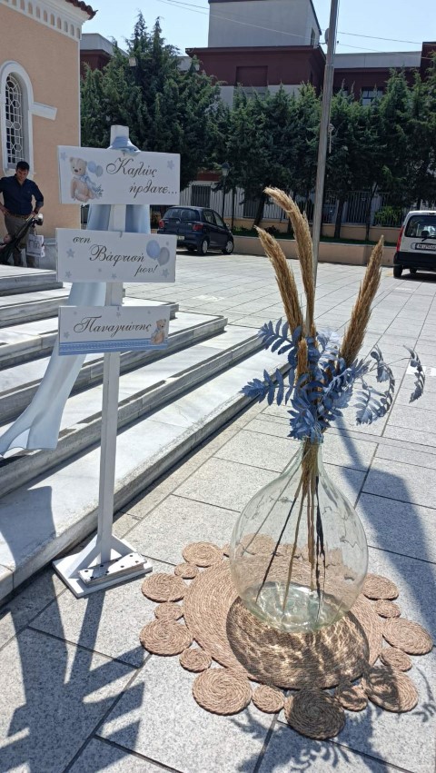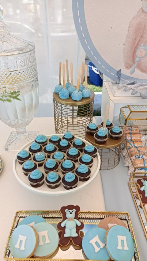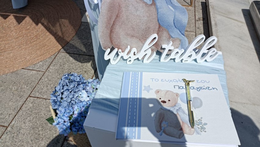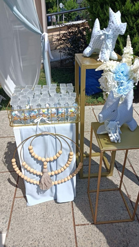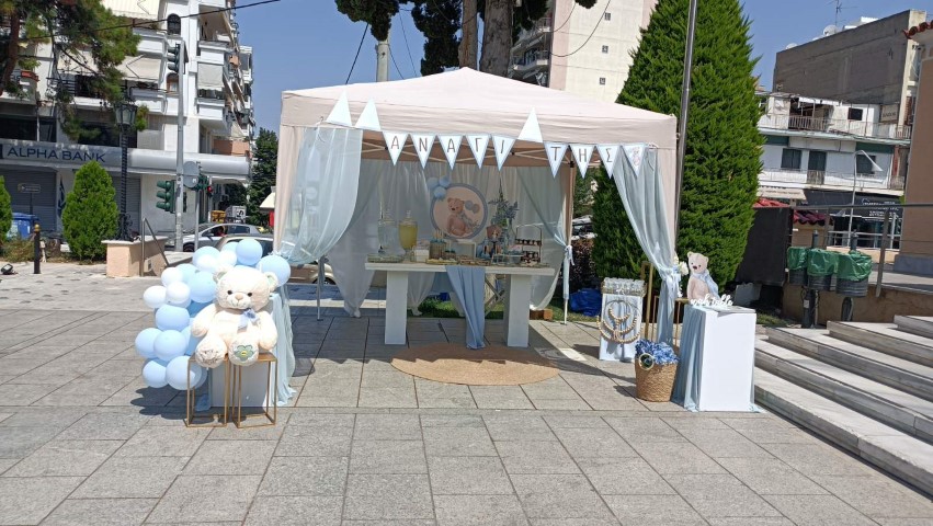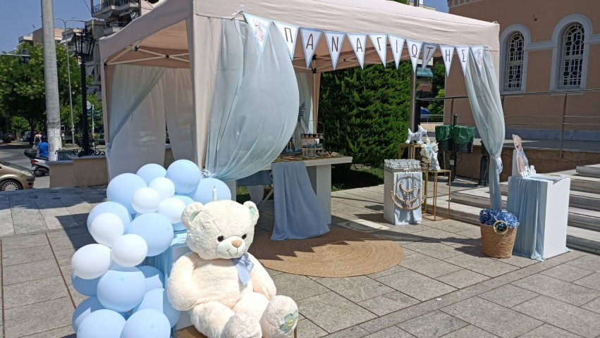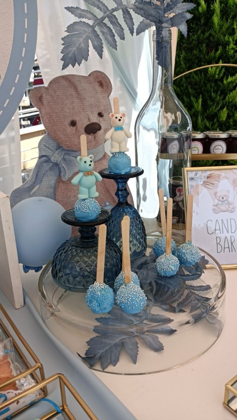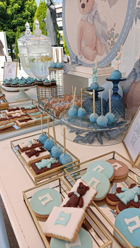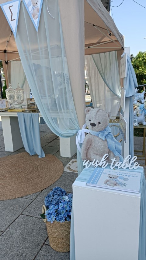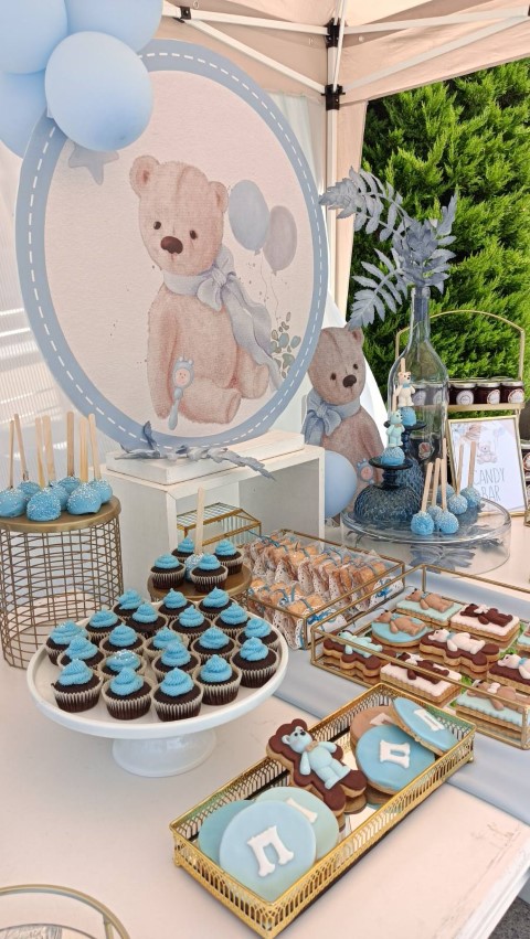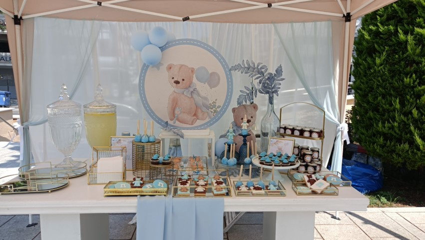 Ένας ξεχωριστός στολισμός βάπτισης με θέμα το αρκουδάκι. Κυριαρχεί το γαλάζιο χρώμα συνδυασμένο με μπεζ και χρυσές αποχρώσεις. Κλέβουν την παράσταση τα λαχταριστά περίτεχνα γλυκά, ο μεγάλος αρκούδος πλαισιωμένος από μπαλόνια και οι μοναδικές μπομπονιέρες βαζάκια. Μία όμορφη και διαχρονική πρόταση στολισμού!