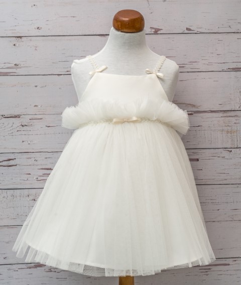 Βαπτιστικό φόρεμα από ρασμίρ ύφασμα στο μπούστο και εντυπωσιακή τούλινη φούστα. Διακοσμημένο με τρέσα από μικρές πέρλες στη μέση και στις τιράντες. Συνοδεύεται με ασορτί κορδέλα για τα μαλλιά. Μπορεί να γίνει παραγγελία σε χρώμα και νούμερο επιλογής σας, κατόπιν συνεννοήσεως με το κατάστημά μας.