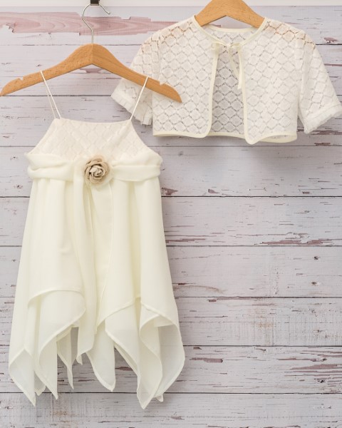 Βαπτιστικό φόρεμα από ύφασμα μουσελίνας με ασύμμετρο ποδόγυρο και ζακετάκι από βαμβακερή δαντέλα. Συνοδεύεται με ασορτί κορδέλα για τα μαλλιά. Μπορεί να γίνει παραγγελία σε χρώμα και νούμερο επιλογής σας, κατόπιν συνεννοήσεως με το κατάστημά μας.