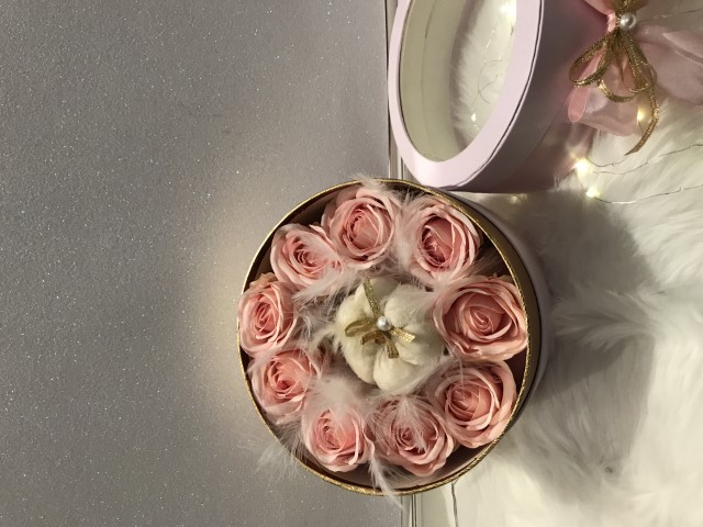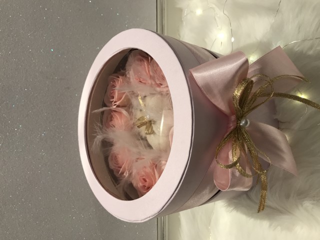 Ροζ συνθετικά τριαντάφυλλα και βελούδινη κολοκύθα, μέσα σε ροζ κουτί καπελιέρα. Το κουτί είναι επενδυμένο με ύφασμα και διακοσμημένο με ροζ κορδέλα. Μία ξεχωριστή πρόταση δώρου. Διάμετρος      Ύψος